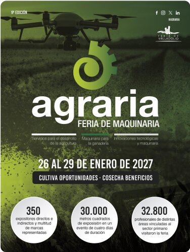 Feria de Valladolid celebrará del 26 al 29 de enero de 2027 una nueva edición de AGRARIA. Tras el éxito de su octava edición, en la que AGRARIA rozó su récord histórico de visitantes y superó las cifras de 2023 incluso antes de su clausura, el certamen afronta su próxima convocatoria consolidado como uno de los grandes encuentros profesionales del sector agrícola en la Península Ibérica.