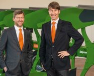 Los directores de Amazone Dr. Justus Dreyer (izquierda) y Christian Dreyer (derecha) junto a una de las novedades, el nuevo arado reversible Cayron 200. Con él se ofrece un programa de maquinaria completo para cualquier agricultor y explotación.