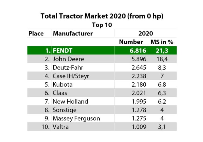La KBA, German Federal Motor Transport Authority (Autoridadfederal alemana de transporte por carretera) publica en enero las cifras denuevas matriculaciones de tractores del año anterior. En 2020, AGCO/Fendt fuelíder de mercado en todas las clases de potencia. Además, Fendt consigue unnuevo récord de cuota de mercado a partir de los 51 CV en Francia.