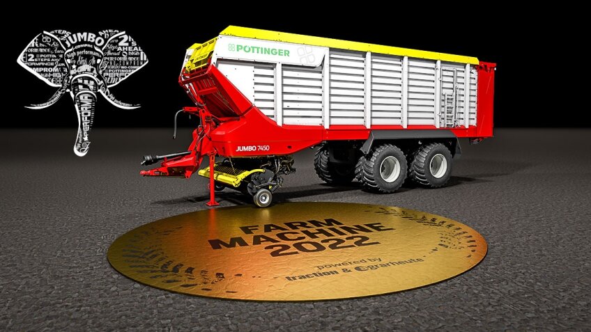 El remolque autocargador de la serie JUMBO 7000 de alto rendimiento de Pöttinger está dos pasos por delante gracias a su alta eficiencia y excelente calidad de trabajo. El nuevo concepto y sus características innovadoras fueron lo que selló la decisión del jurado para "FARM MACHINE 2022". El JUMBO ganó el voto de los periodistas comerciales en la categoría cosecha de forraje. El premio se entregó en línea el 4 de marzo de 2022.