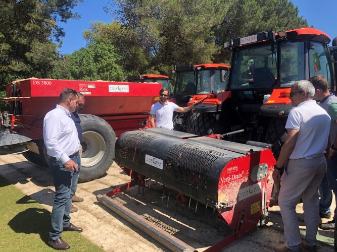 Loscampos de golf requieren un mantenimiento muy meticuloso, por ello AntonioGálvez, gerente de Tinegolf, recalca la importancia de contar con tractores conunas características muy definidas y que tengan una medida muy concreta,exactamente igual que la máquina, para poder realizar correctamente laborescomo el pinchado, recebo, verticutt, escarificado, etc.