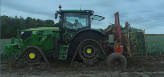 Un tractor sacando puerros con las bandas de goma Soucy Track que comercializa Agrícola Castellana.