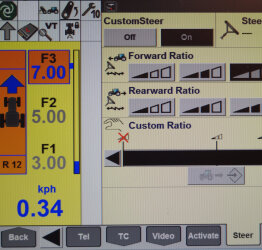 Los operadoresapreciarán las ventajas de CustomSteerTM en una gran variedad detareas, como maniobrar durante las labores con pala y girar más rápido con menos esfuerzo encabeceras cortas durante los trabajos de arado y siembra. Por su parte, el ajuste 1:1 en marcha atrásfacilita el trabajo de la dirección al retroceder con un remolque. Para obtenerel máximo control de la dirección, las relaciones pueden cambiarautomáticamente con el sistema HTS II de giro en cabecera. Una relación paratrabajar, otra para girar en cabecera y una tercera para avanzar marcha atrás,y todas ellas se pueden ajustar con manera automática