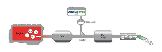 El producto se inyecta en la conducción de los gases de escape donde tiene lugar la reacción química que transforma el NOx en vapor de agua y nitrógeno. Los vehículos diésel con sistema SCR y AdBlue® o Effinox como agente reductor tienen niveles de emisión de NOx muy bajos. Además, emiten menos CO2 y consumen menos combustible que los coches de gasolina.
