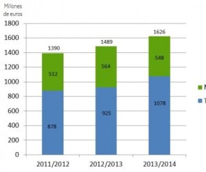 En cuanto al volumen de ventas,el grupo KRONE cierra el año financiero 2013/2014 generando unos ingresos que superan los 1600 millones de euros, lo que representa un incremento del 9% respecto al año anterior que fueron aproximadamente unos 1500 millones de euros.
