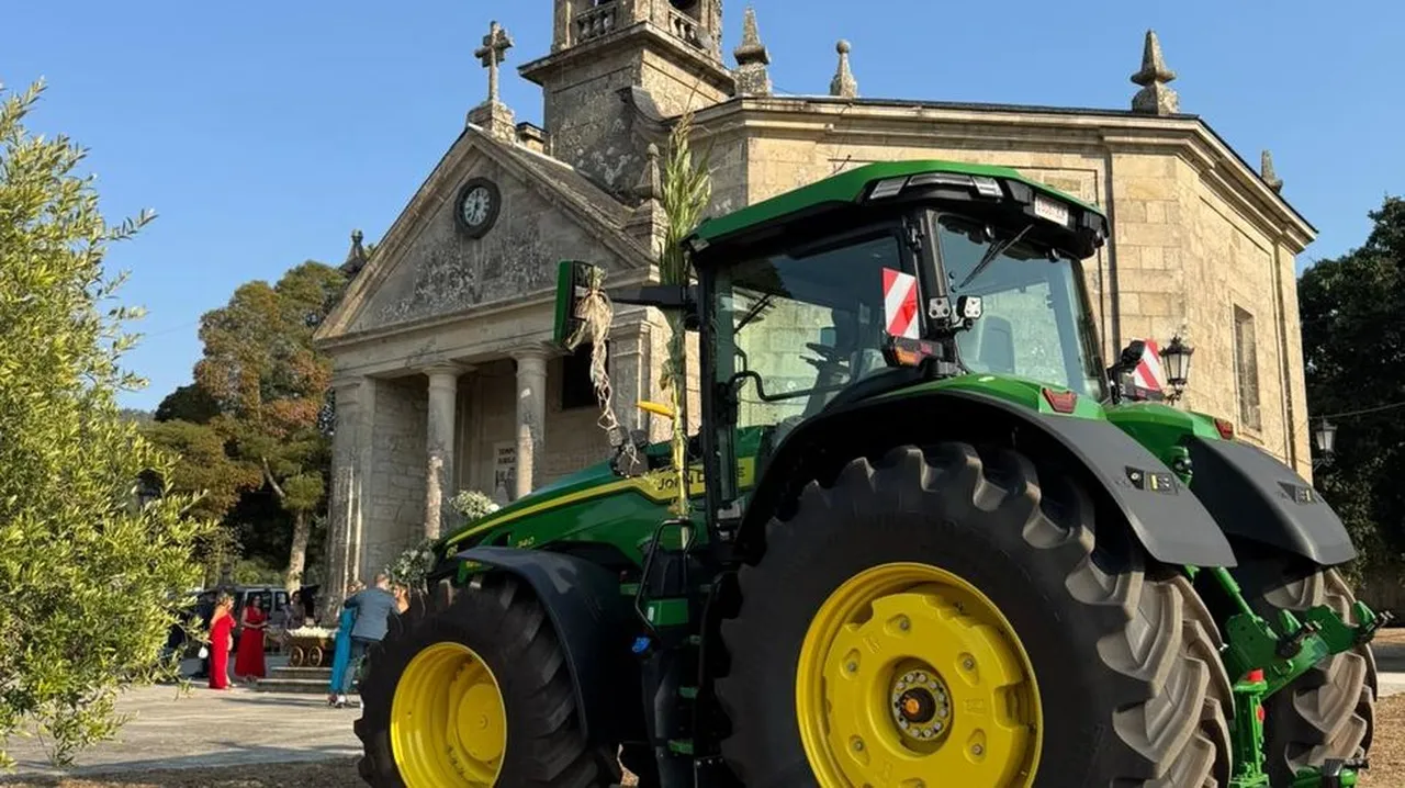 Una pareja de santiagueses se casa en Amil (moraña) y llegaal banquete de su boda en un enorme John Deere engalanado con espigas de maíz.