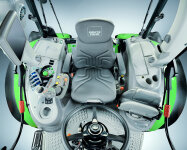 El puesto de conducción también incorpora interesantes novedades como el salpicadero con pantalla a color, opciones de climatización o el nuevo mando de control para gestionar la transmisión TTV. La cabina ahora va montada sobre casquillos hidráulicos (Hydro silent-block), que reducen el ruido y las vibraciones hasta en un 40% en comparación con el sistema tradicional. Además, para los que precisen aún de mayor comodidad, es posible incorporar sistemas de suspensión mecánica o neumática.